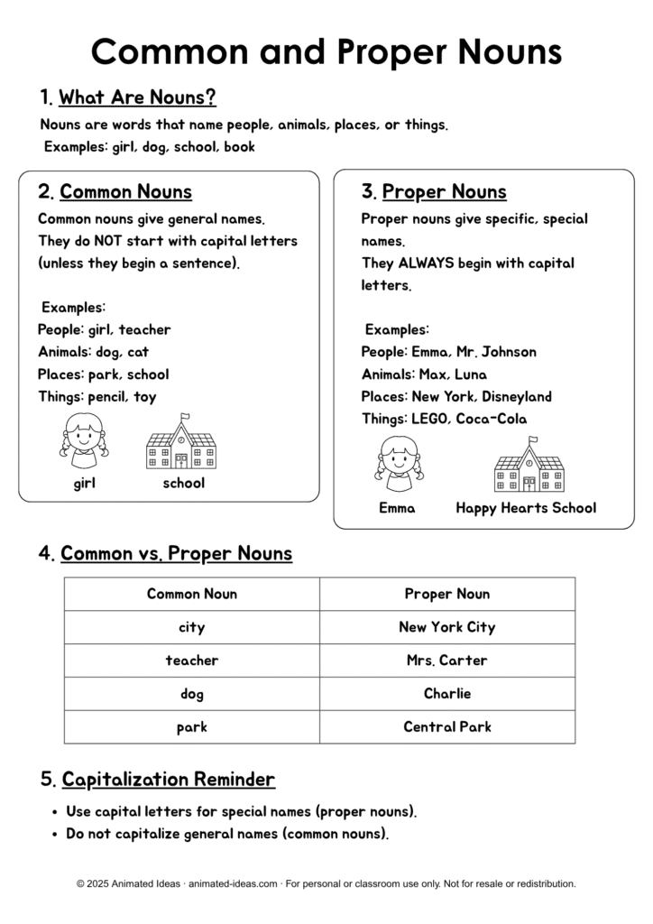 Understanding Common and Proper Nouns is an important skill for young learners. In this lesson, students will explore how names of people, places, animals, and things can be general or specific. With clear examples and simple explanations, this guide helps children recognize nouns easily and build a strong grammar foundation.