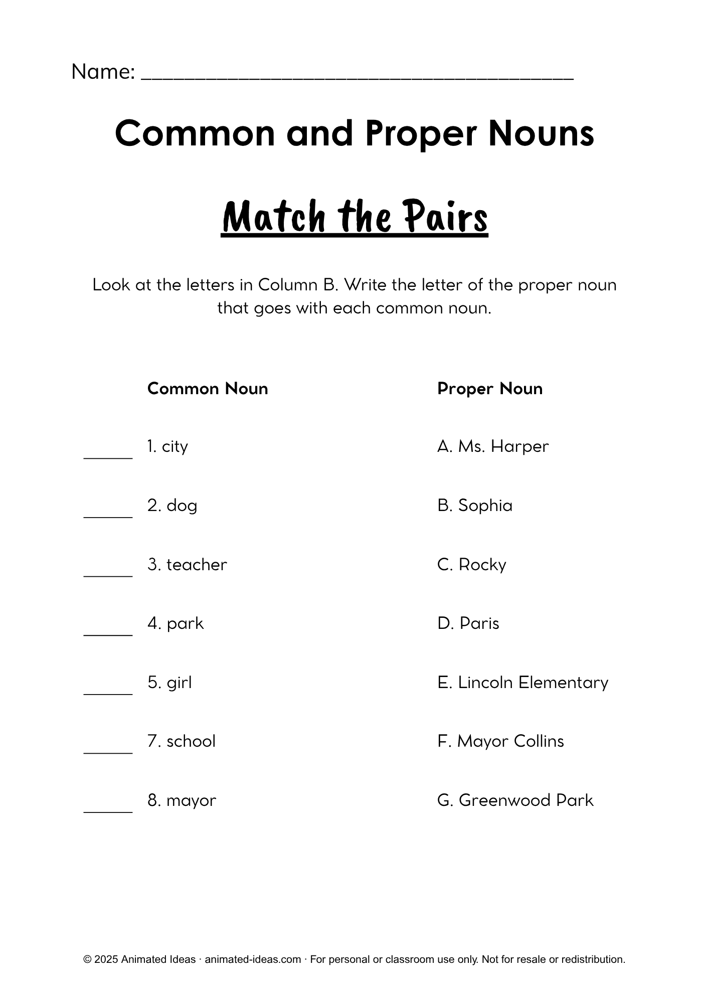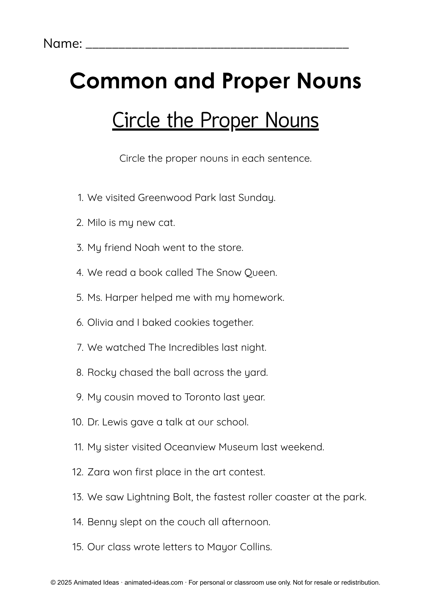Thank you for reading this lesson guide about Common and Proper Nouns. We hope it helped you understand the difference between general and specific names. To continue learning and practicing English grammar, check out more worksheets from Animated Ideas, including Mass and Count Nouns, Singular and Plural Nouns, and Pronouns – Words that Replace Nouns.