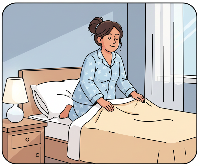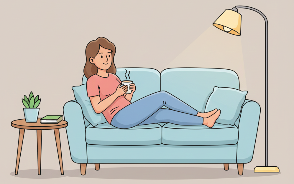 The verb relax means to rest and feel calm after working, studying, or doing activities. It usually happens in the evening or after finishing tasks.