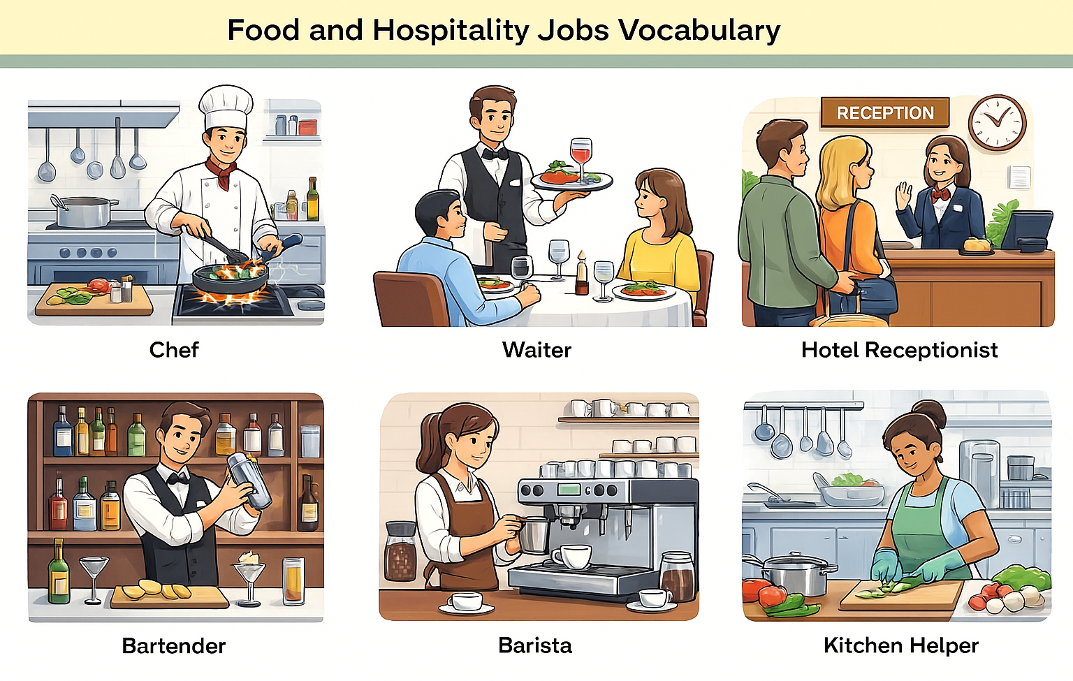 These jobs focus on cooking food, serving customers, and helping guests feel comfortable.