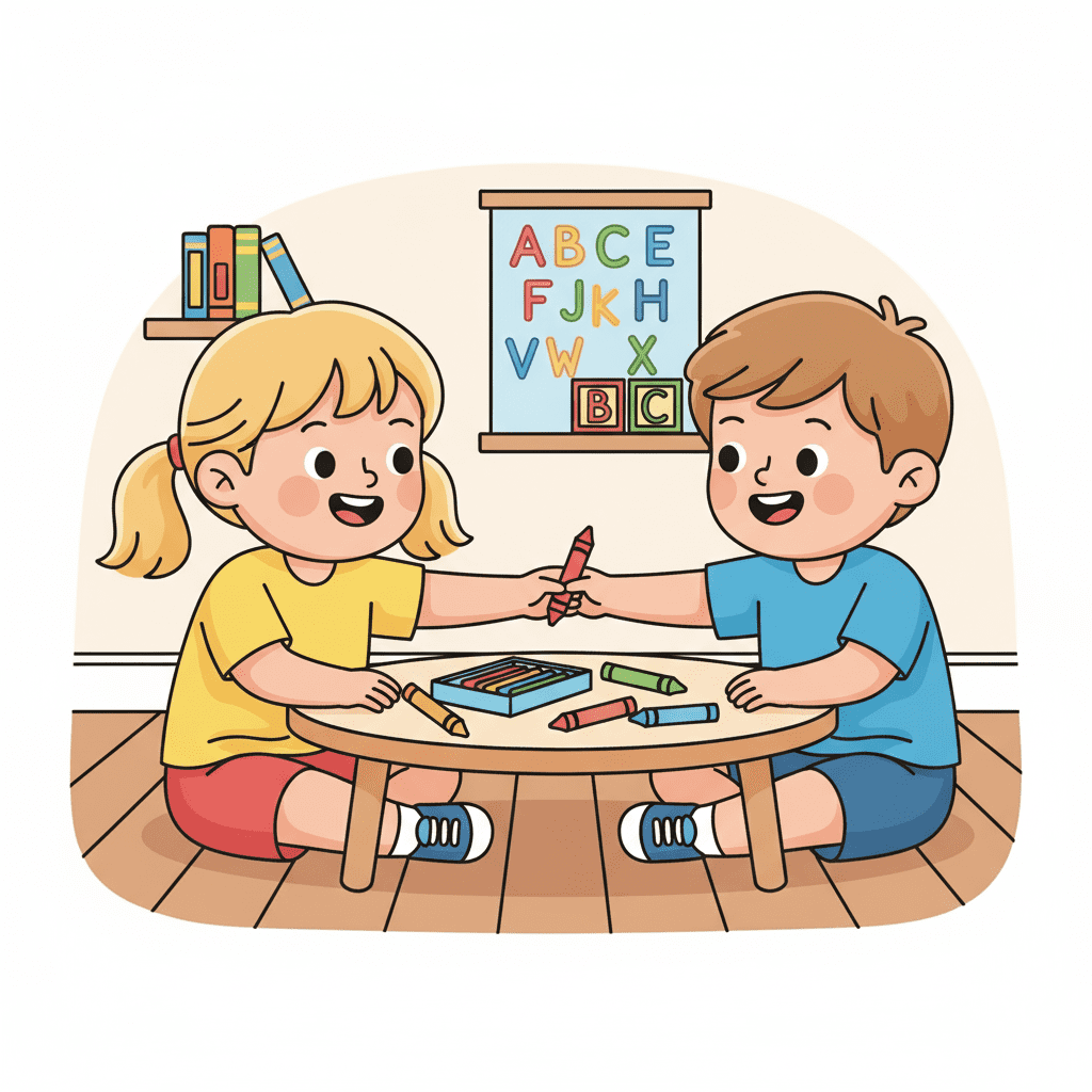 We share our toys, crayons, and books with friends.