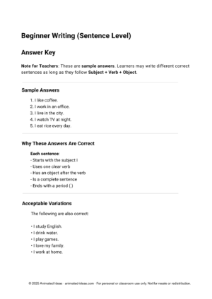 This Subject Verb Object writing worksheet helps beginner ESL learners write clear, simple sentences using the S + V + O structure. Ideal for sentence-level writing practice.
