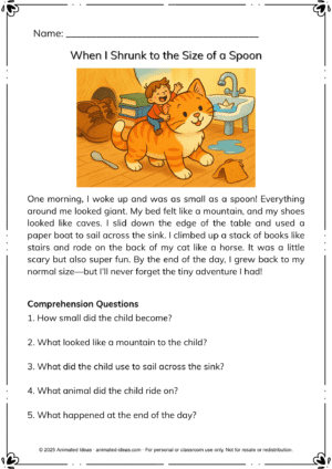 This 3-worksheet reading bundle features imaginative stories: My Pet Lizard’s Birthday Party, When I Shrunk to the Size of a Spoon, and The Day My Shoes Walked Without Me. Perfect for grades 2–4 reading practice!