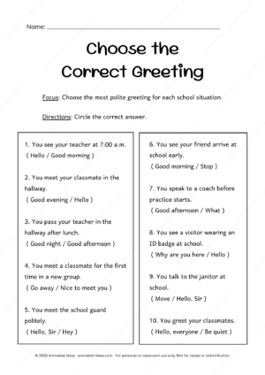 Polite Greeting Worksheets for Grade 3 are designed to teach school manners clearly and effectively. This printable ESL bundle includes varied activities, rewrite tasks, identification exercises, and answer keys. Each worksheet fits A4 size and focuses on one rule at a time. Perfect for classroom use, homework, or assessment.