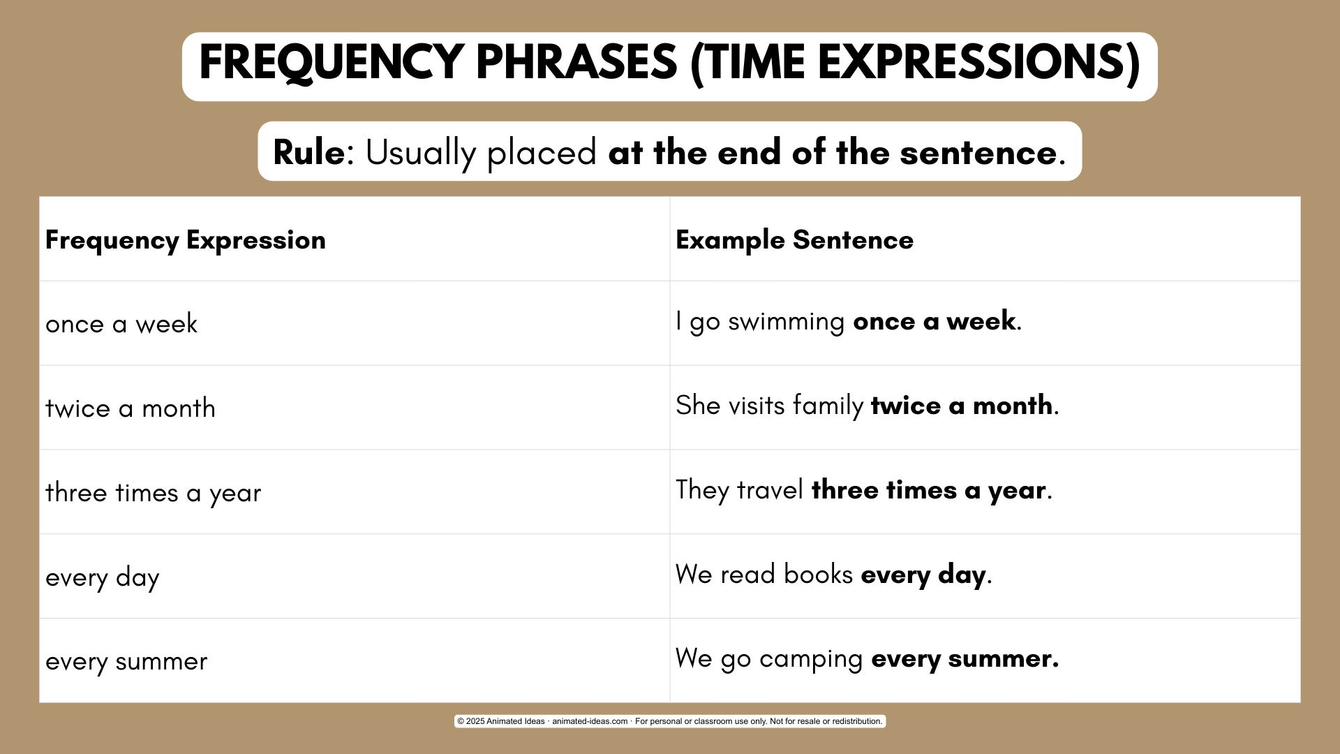 This chart explains end-of-sentence placement. It covers phrases like once a week and twice a month.