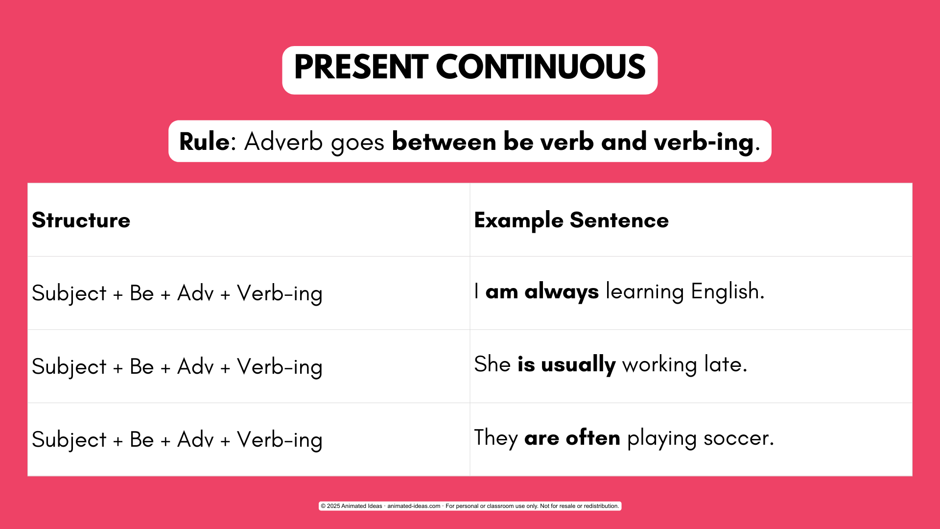 This chart shows placement after am, is, and are. It prevents common learner mistakes.
