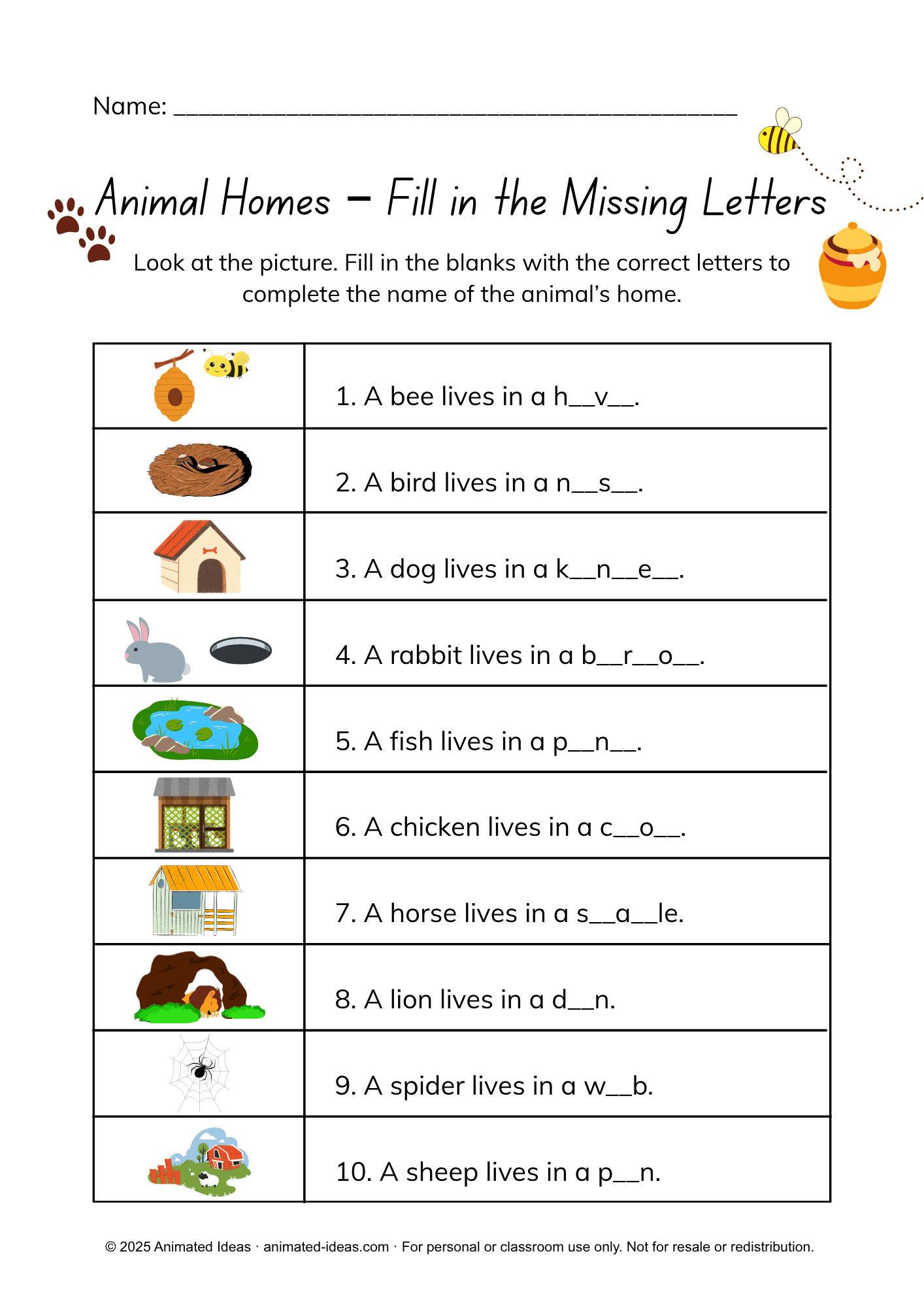 Engage kids with this fun Animal Homes Worksheet. Students complete missing letters to match animals with their homes using picture clues.