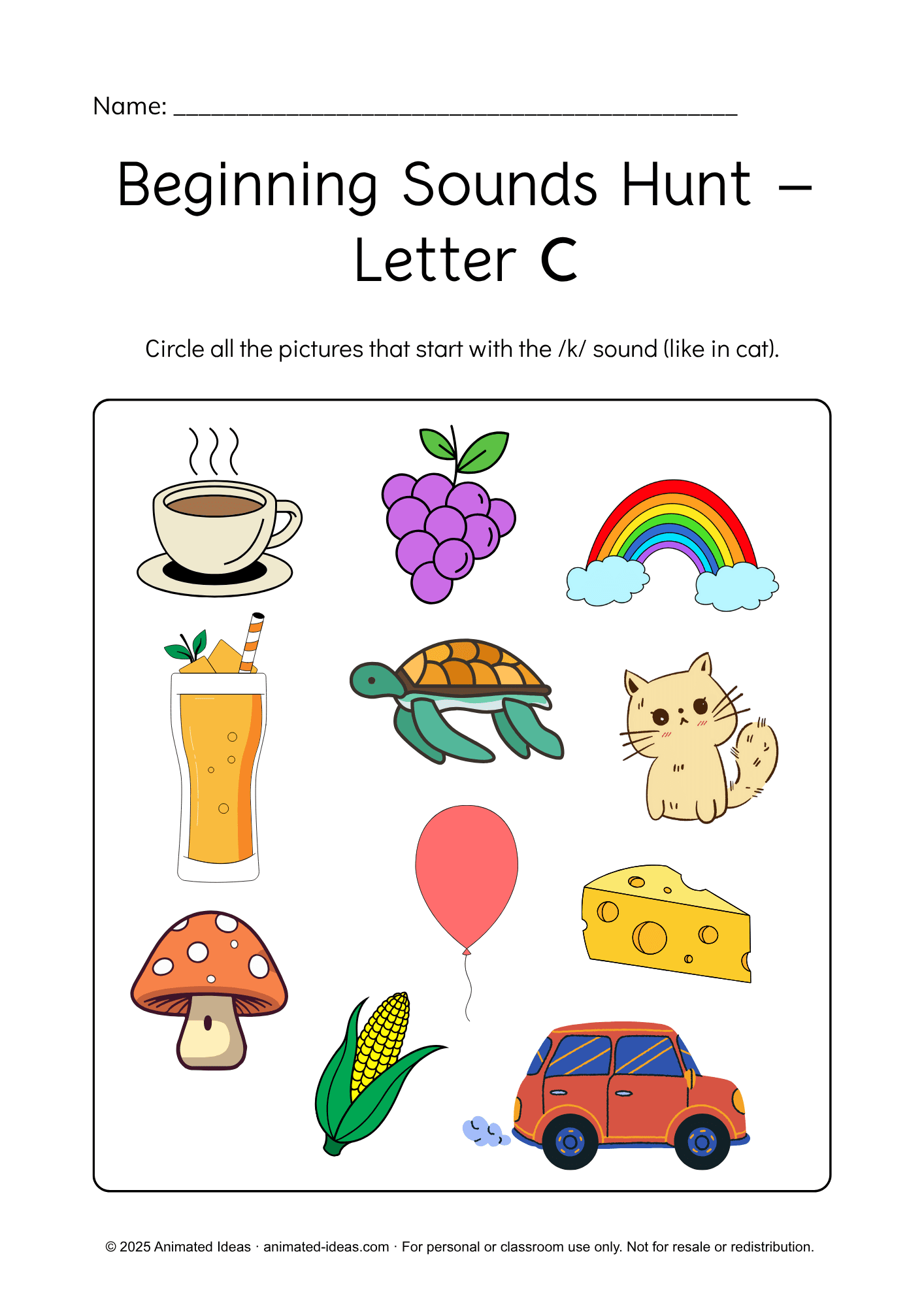 The Beginning Sounds Worksheets (Letters A–C) support preschool and kindergarten learners as they develop basic phonics skills. Each worksheet focuses on one letter and asks children to circle the pictures that begin with its sound. This activity strengthens early reading skills and helps young learners connect letters with real-world objects.