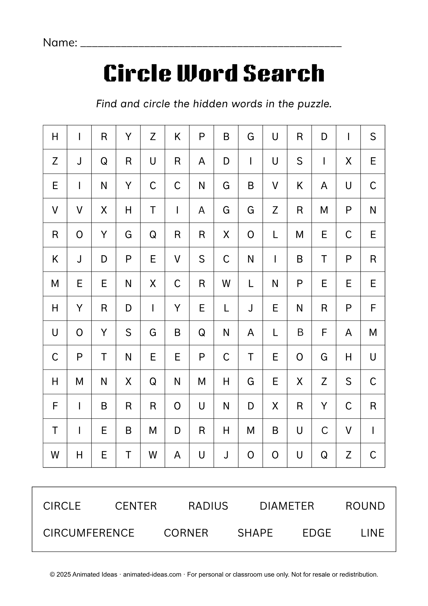 🔍 Circle Word Search – Find and circle circle-related vocabulary words.
