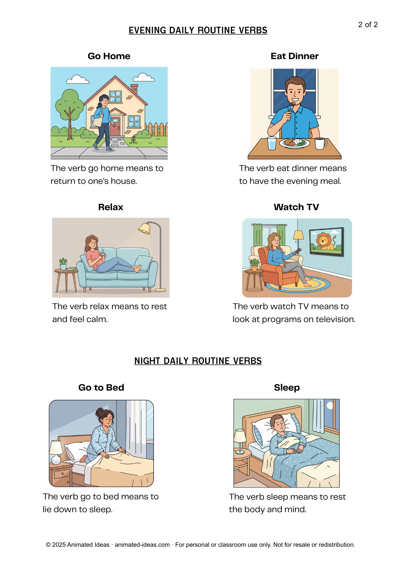 Daily routines are part of everyday conversation. Learners talk about them early and often. That is why these daily routine verbs printable notes focus on clarity and structure. The notes explain common routine verbs using simple language and realistic examples. This makes lessons smoother and more effective.