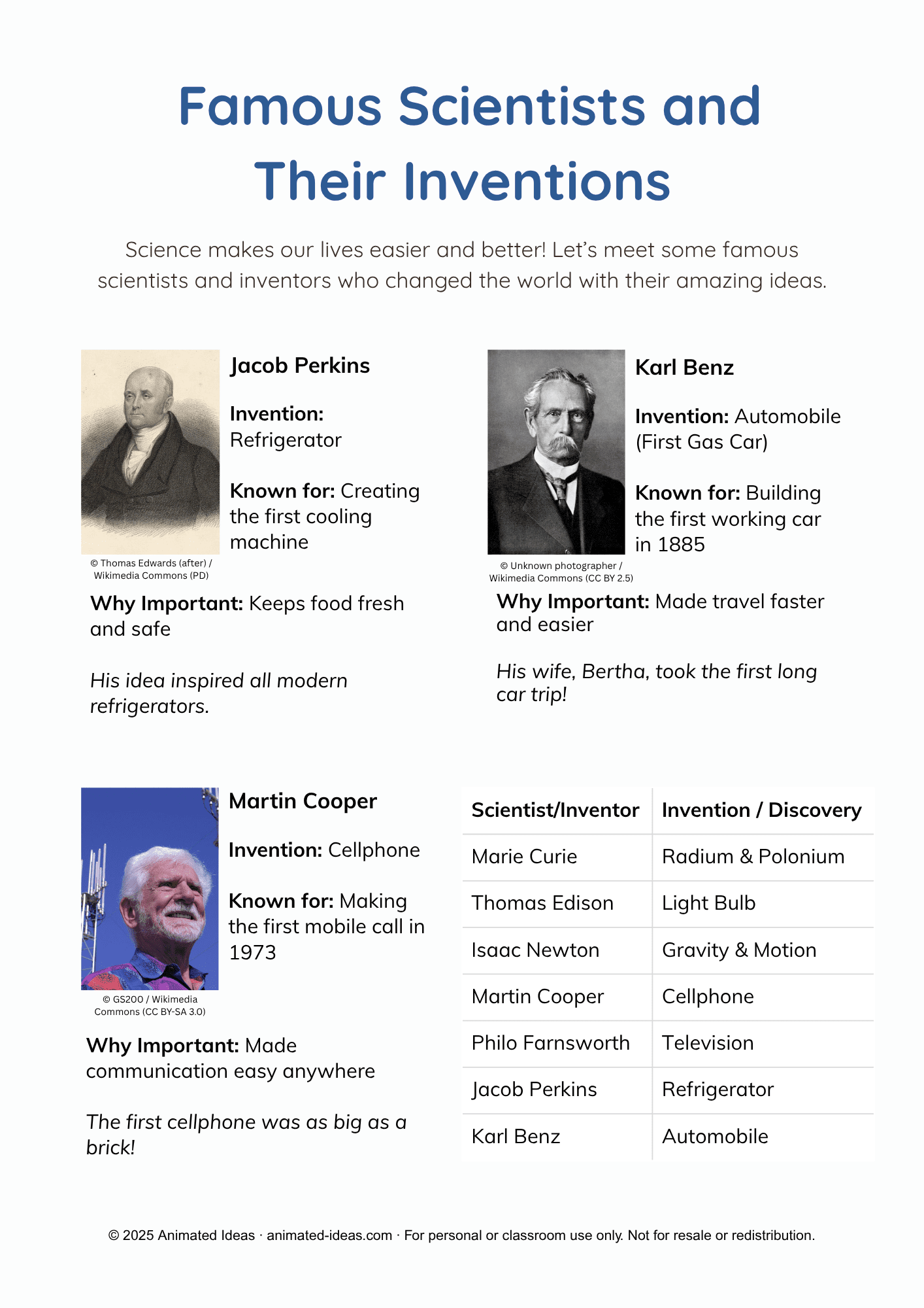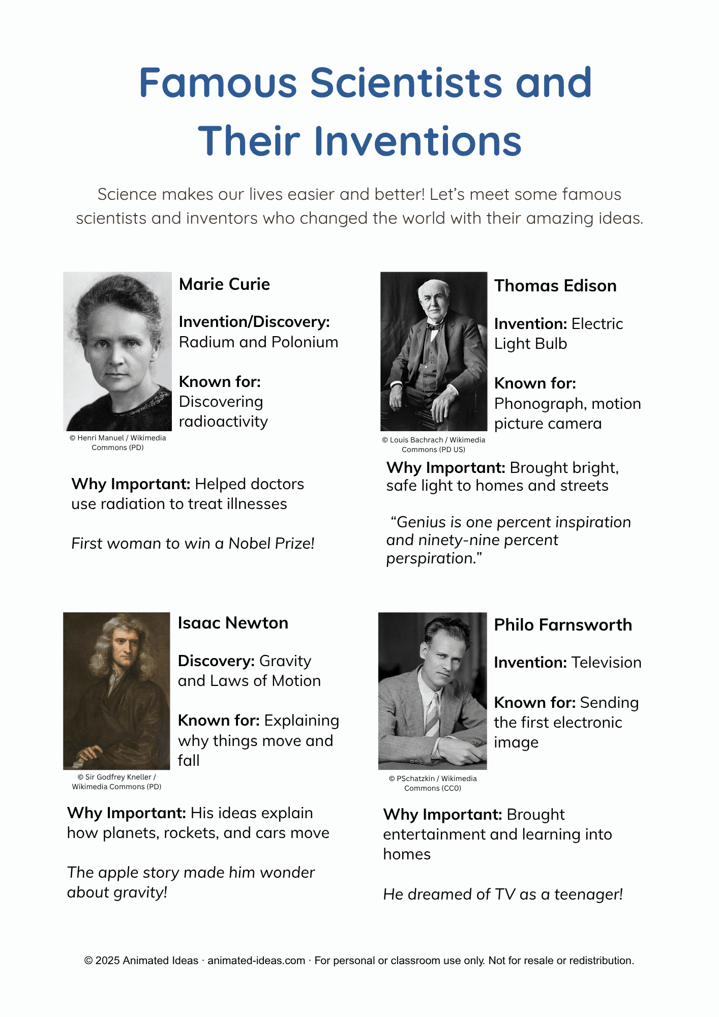 Printable handouts about famous scientists and their inventions for students. Includes Marie Curie, Thomas Edison, Isaac Newton, Philo Farnsworth, Carl Benz, Martin Cooper, and Jacob Perkins. Perfect for classroom, homeschool, or self-study. Recommended worksheets from Animated Ideas included.