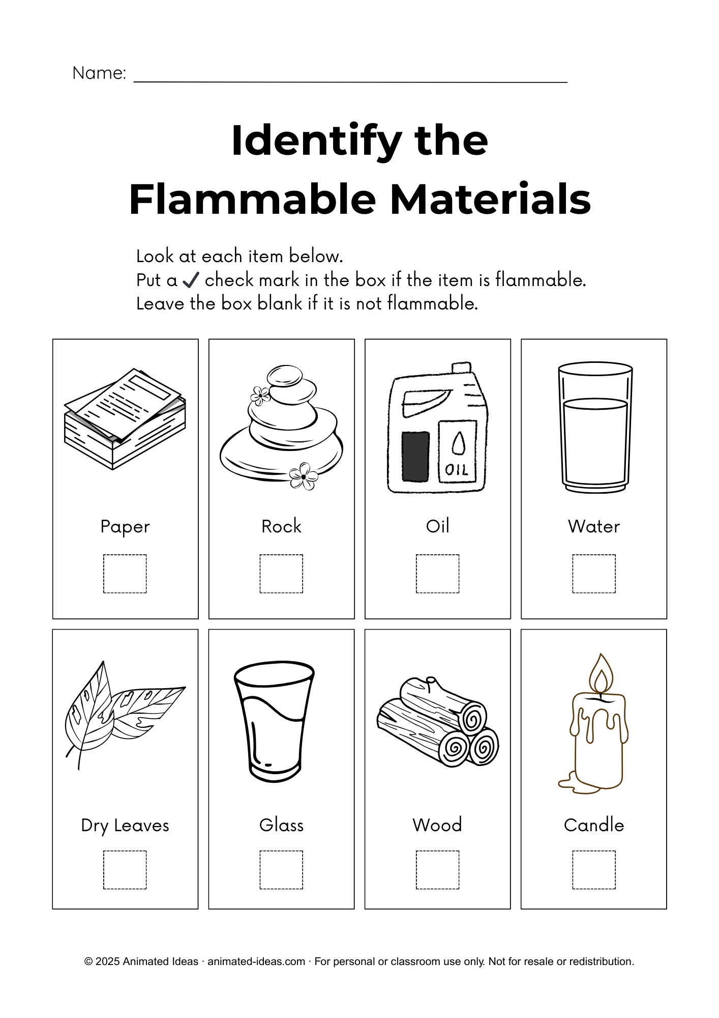 This worksheet helps students recognize items that catch fire easily. Learners check a box for flammable objects. They leave non-flammable items blank. As a result, students learn classification skills. They also improve visual recognition.