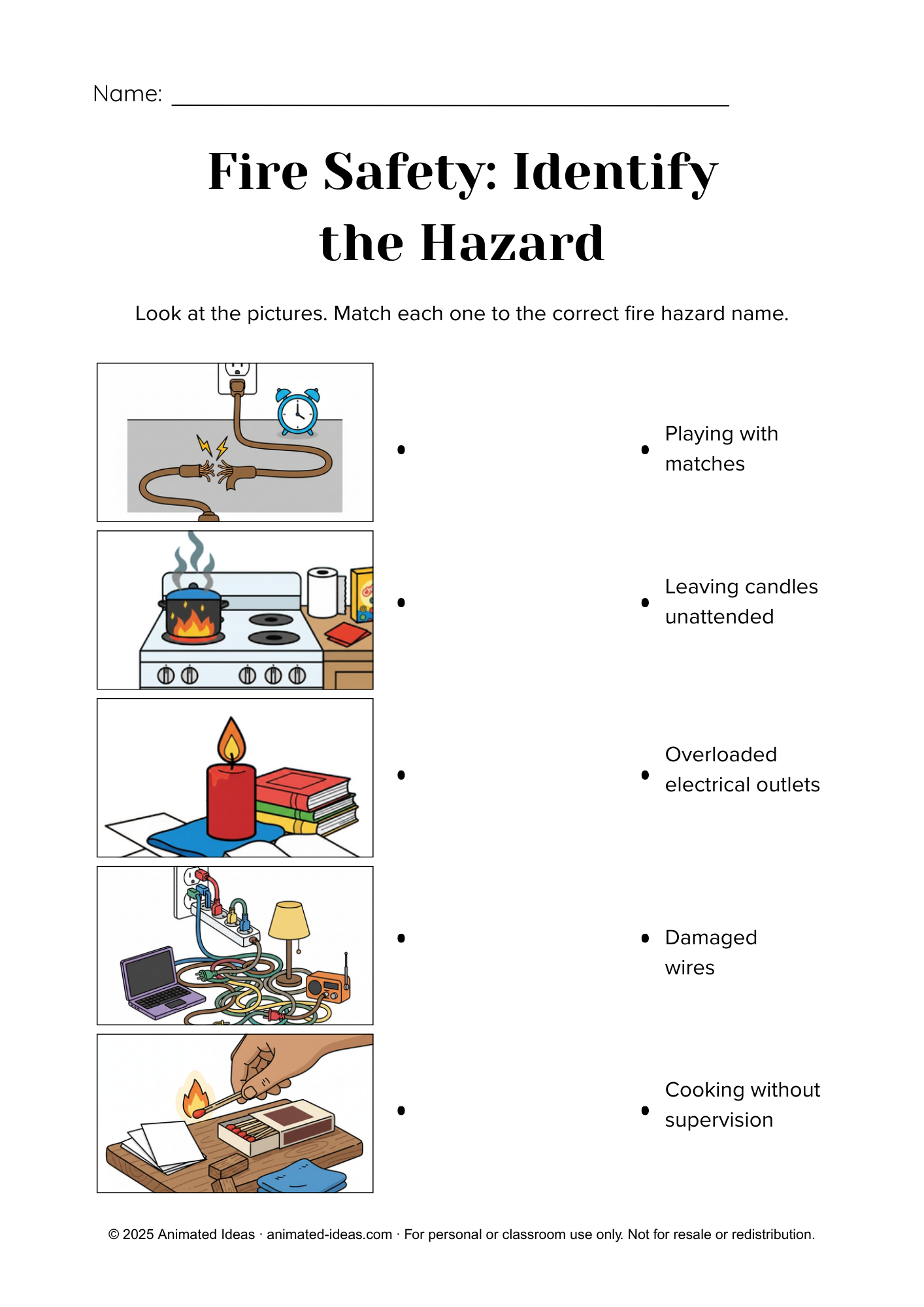 This worksheet uses pictures of common fire hazards. Students match each image to its correct name. This strengthens visual literacy. It also improves hazard recognition.