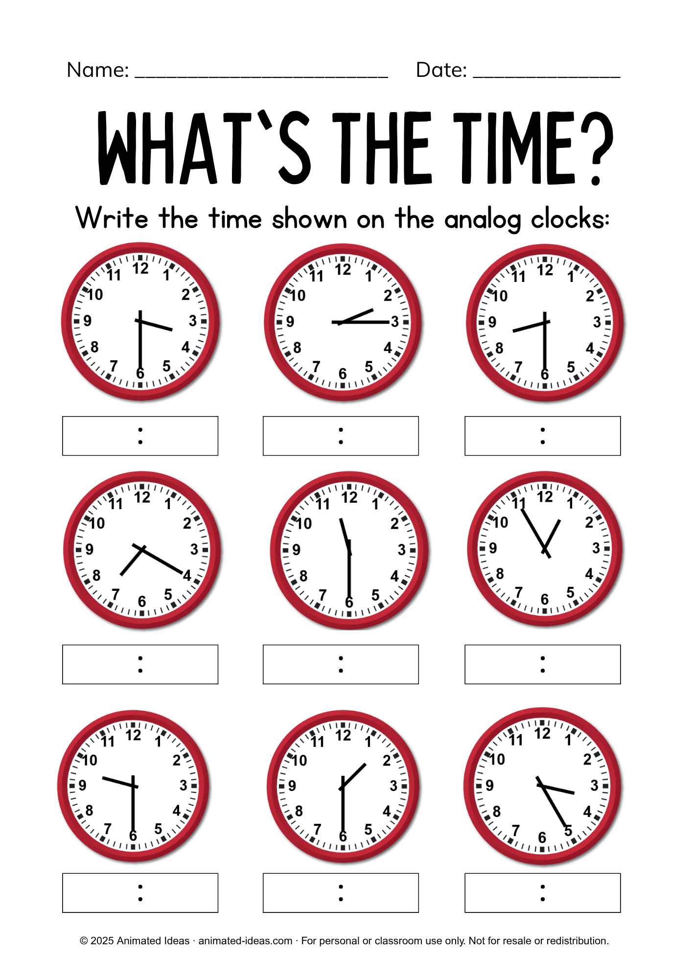 Help your learners practice telling time with these free clock worksheets. They’ll work on reading analog clocks and writing the correct time – perfect for kindergarten and Grade 1 students. Great for daily practice, review, or early finishers!