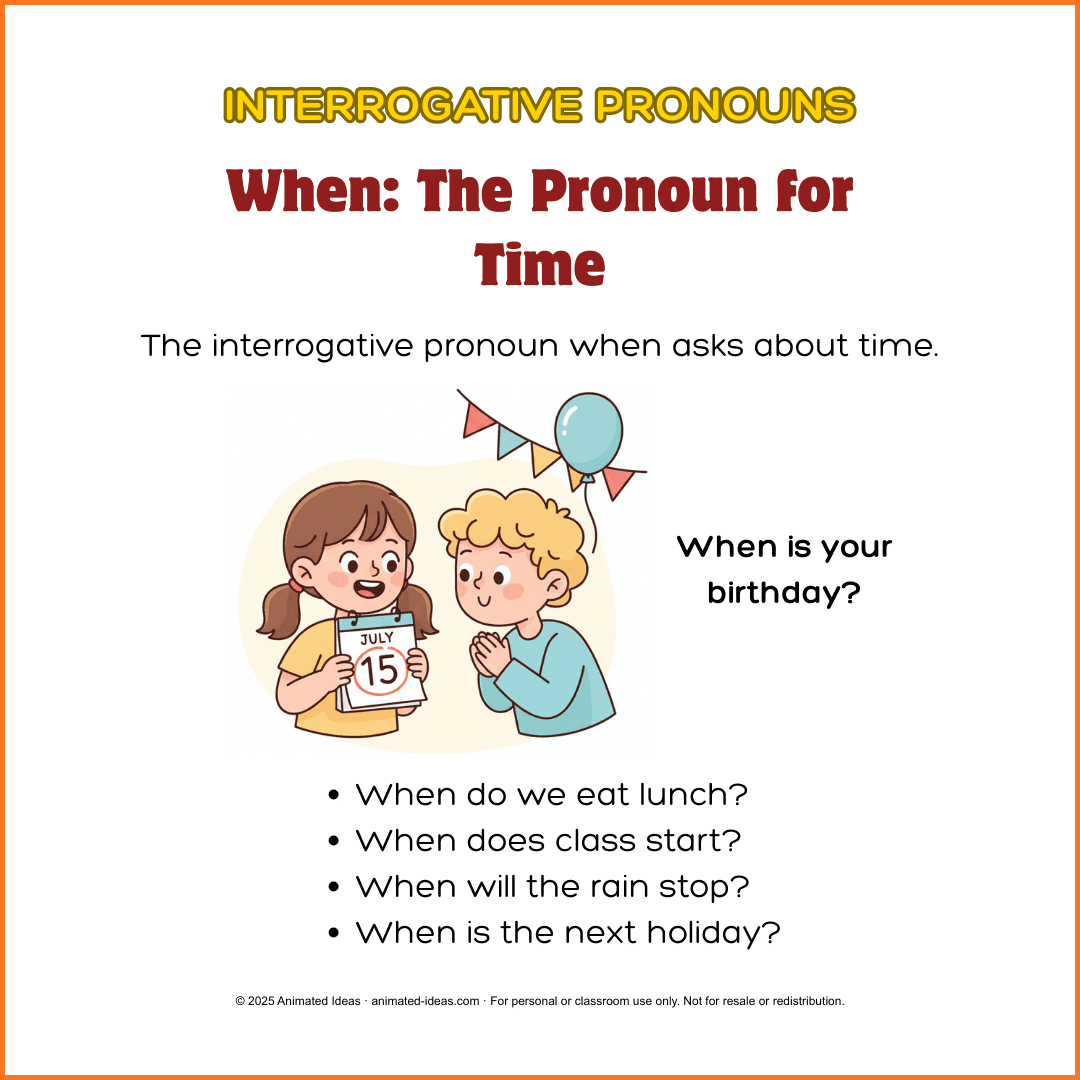 Use when to ask about time or dates. For example: “When is your birthday?” Students learn to use when naturally in conversation.