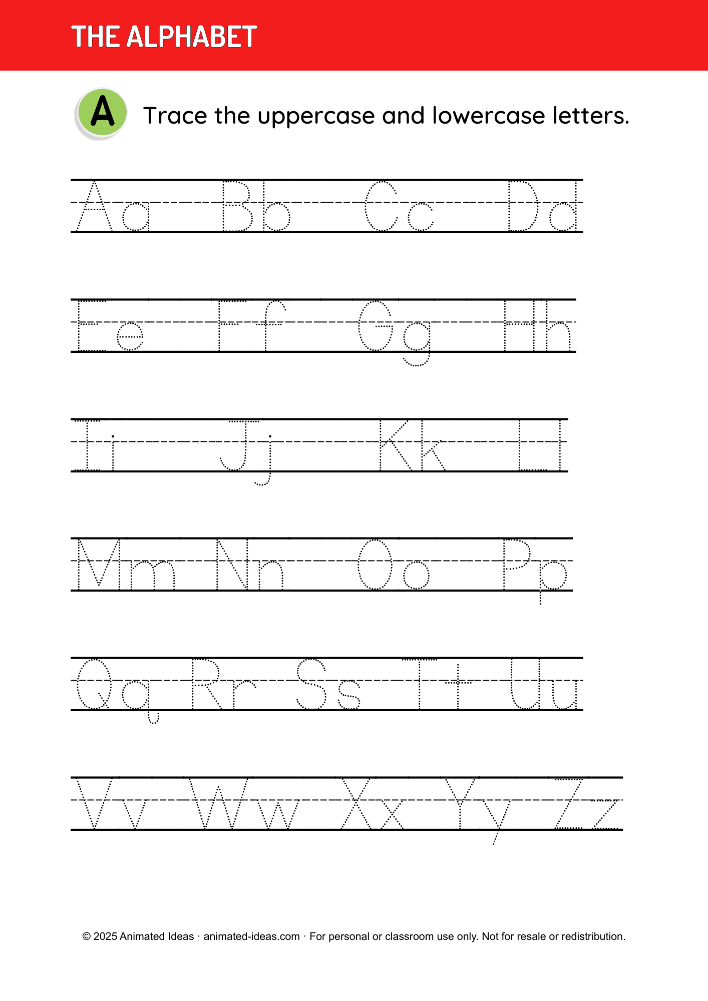 These worksheets are designed to support early learners in recognizing and writing the alphabet. Kids will trace both uppercase and lowercase letters, boosting their handwriting, phonics, and reading readiness.