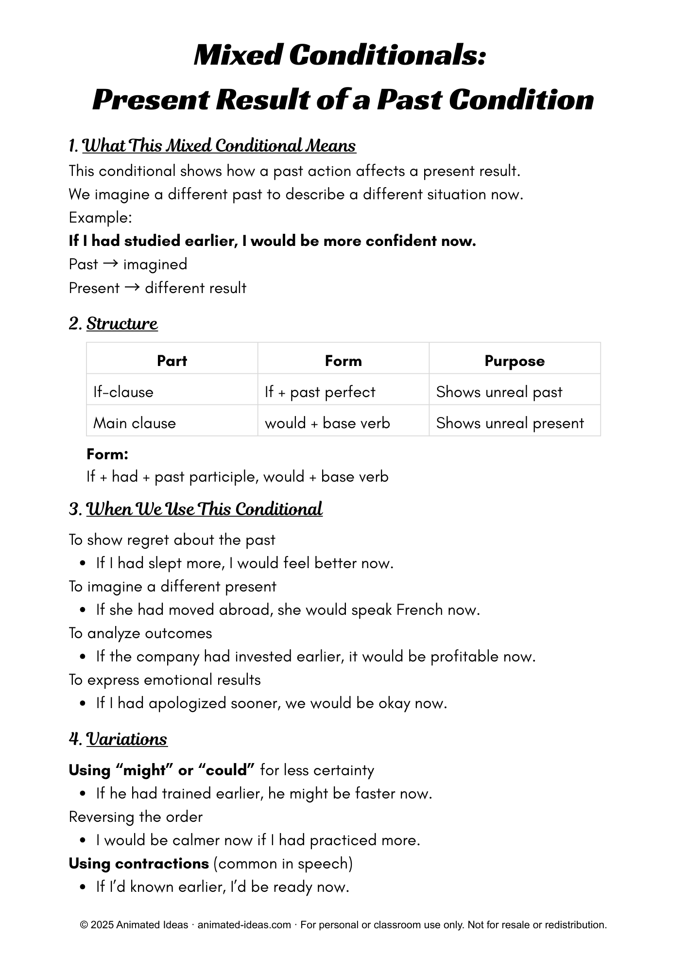 This resource explains how an unreal past action creates an unreal present situation. It shows why English uses this structure and how it differs from other conditional forms. As a result, learners gain clarity and confidence when expressing complex ideas.