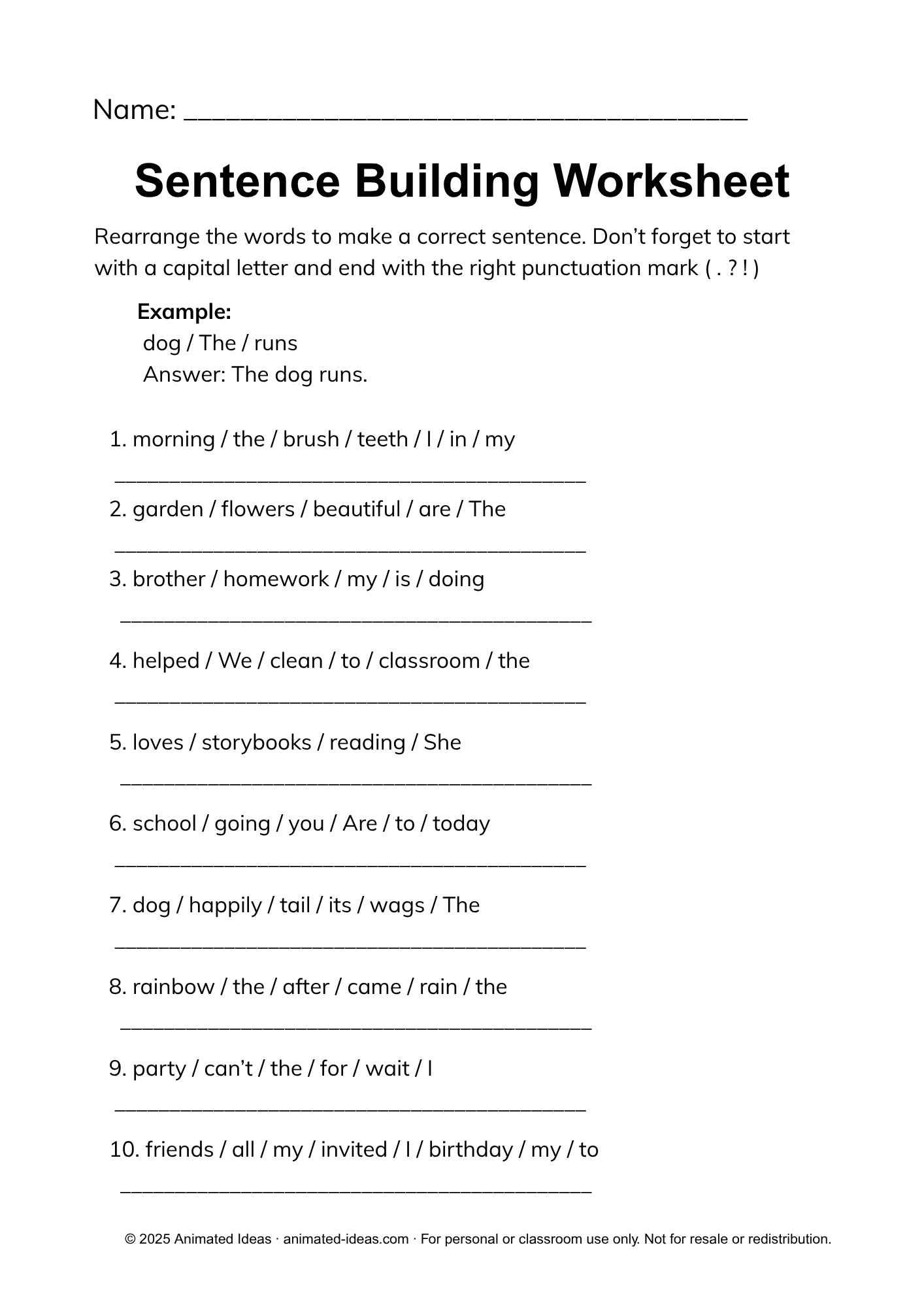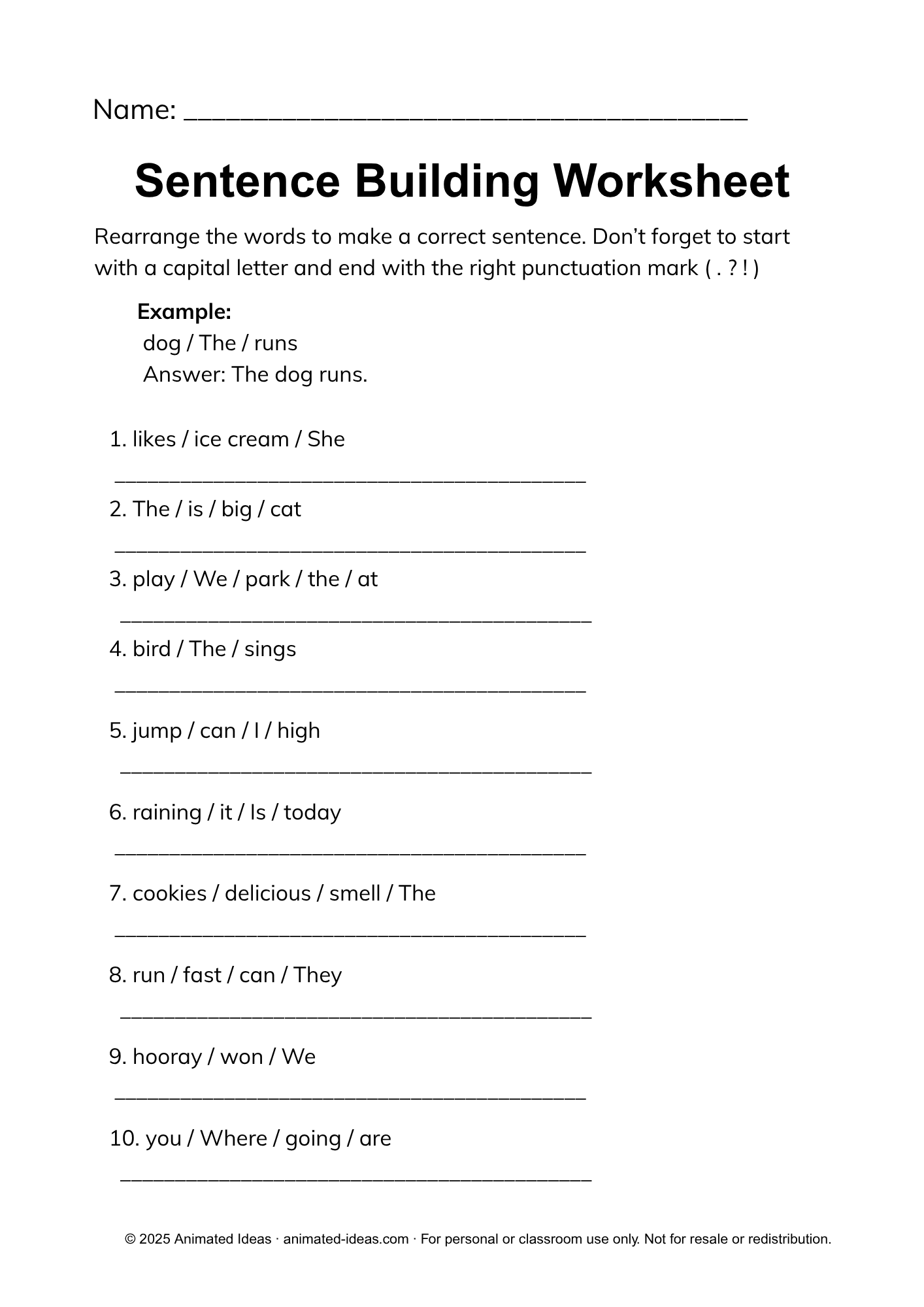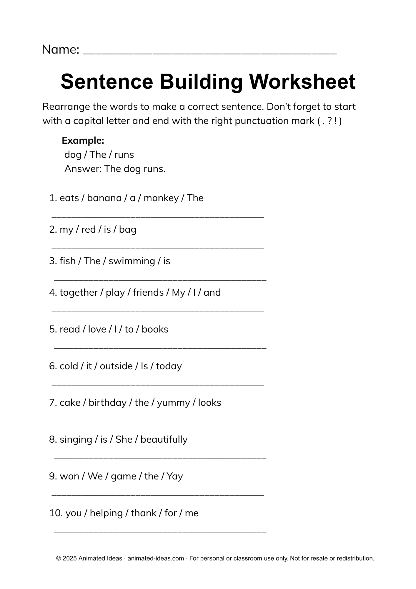 Make grammar fun with these Sentence Building Worksheets! Kids practice rearranging mixed-up words to form correct sentences with proper capitalization and punctuation. Perfect for classroom or home use.