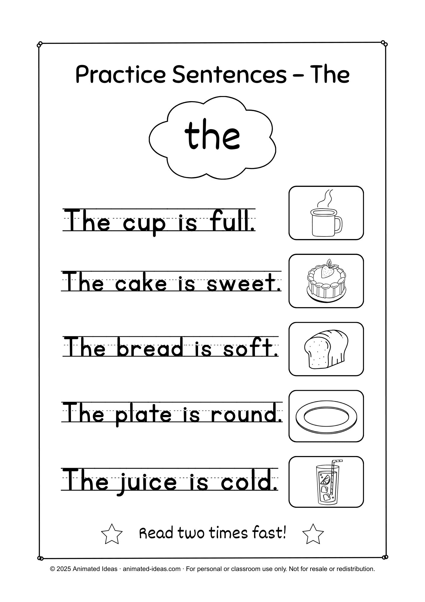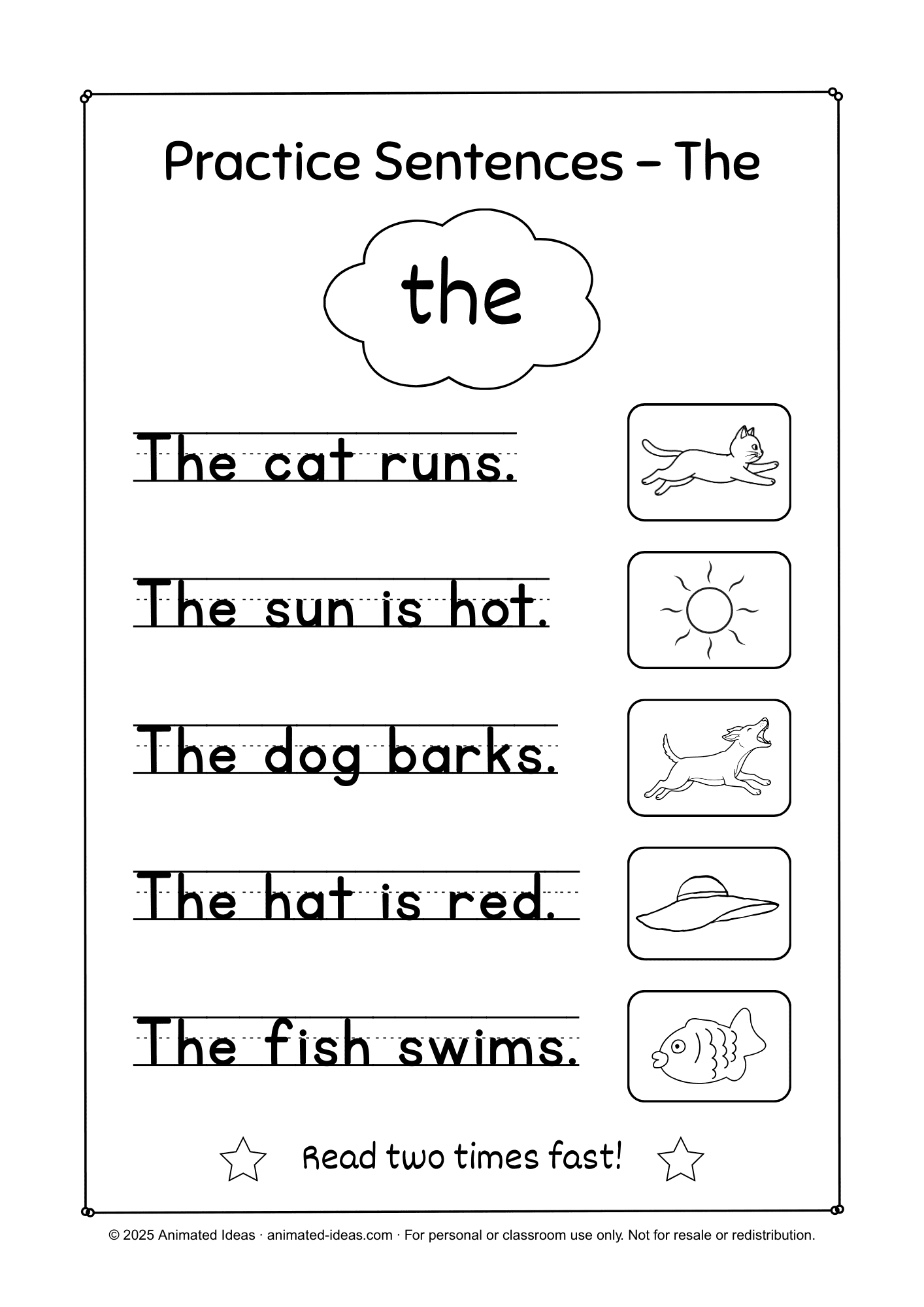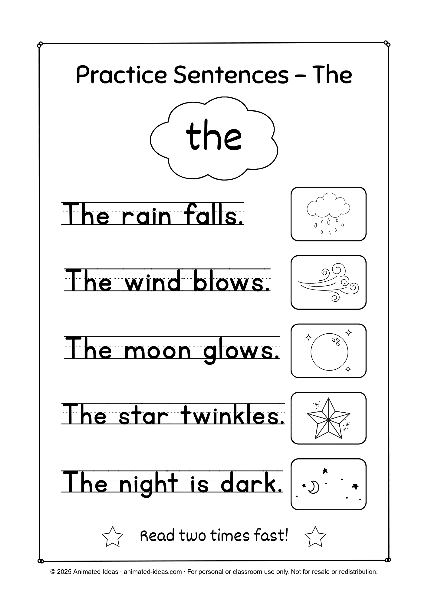 This printable handout is all about the sight word the. It is designed for young readers, especially in Kindergarten and Grade 1, who are just starting to build their reading skills. The sentences are short and simple, like The cat runs or The sun is hot, and each one comes with a small visual. Because of this, kids can understand the word more easily and remember it better.