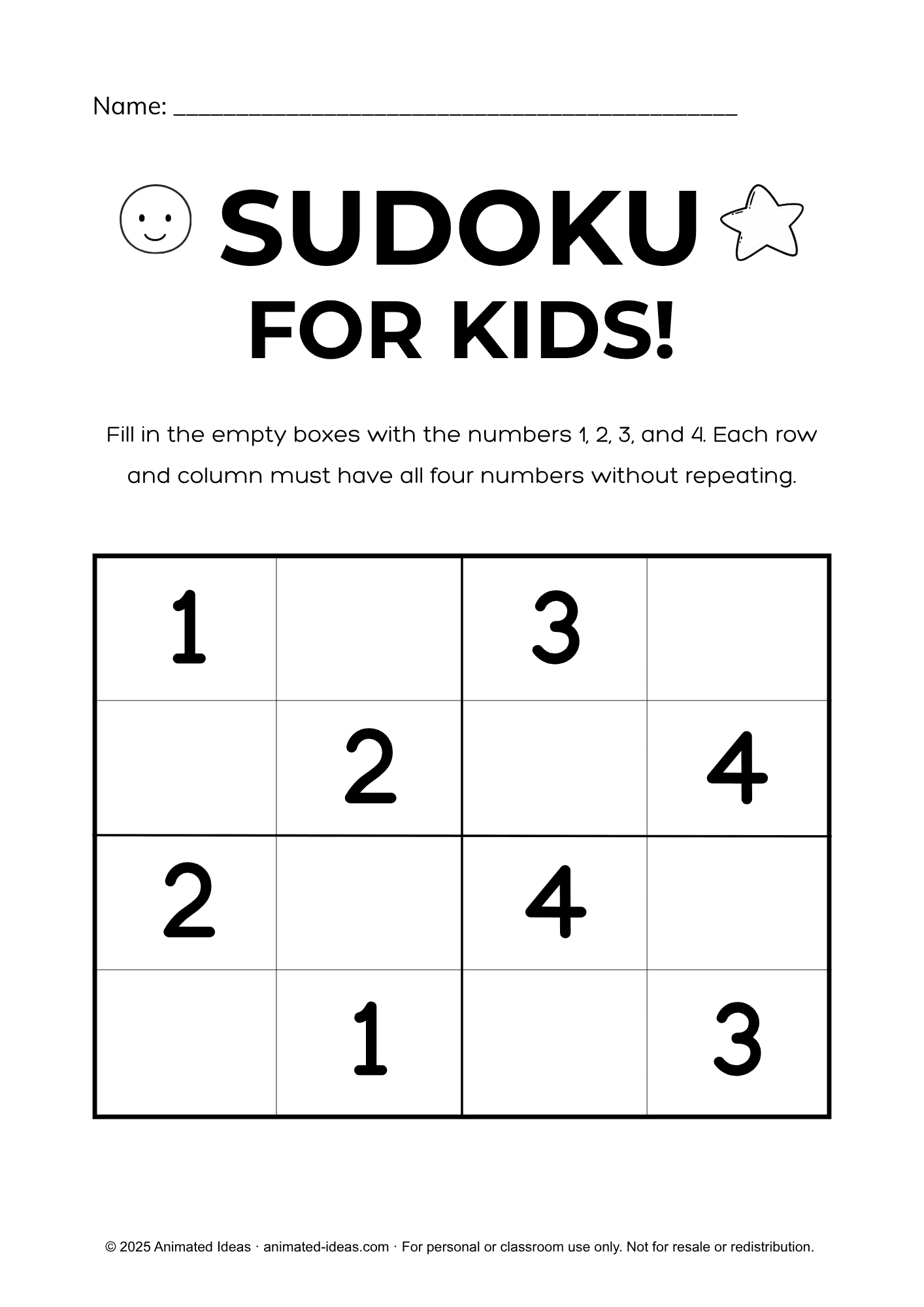 This printable Sudoku worksheet is a great addition to your early learning materials — helping children think critically while having fun!