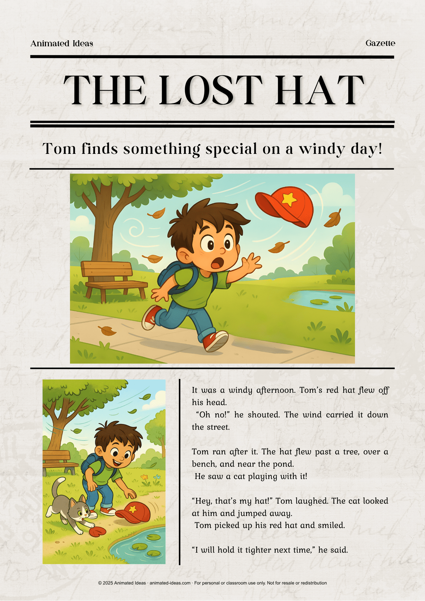 The Lost Hat Gazette is a delightful and easy-to-read story designed for beginner readers. On a windy afternoon, Tom’s red hat flies off his head and takes him on a playful chase through the park. Along the way, he spots a cat playing with it! The story is simple, funny, and great for early learners to build vocabulary and reading confidence.