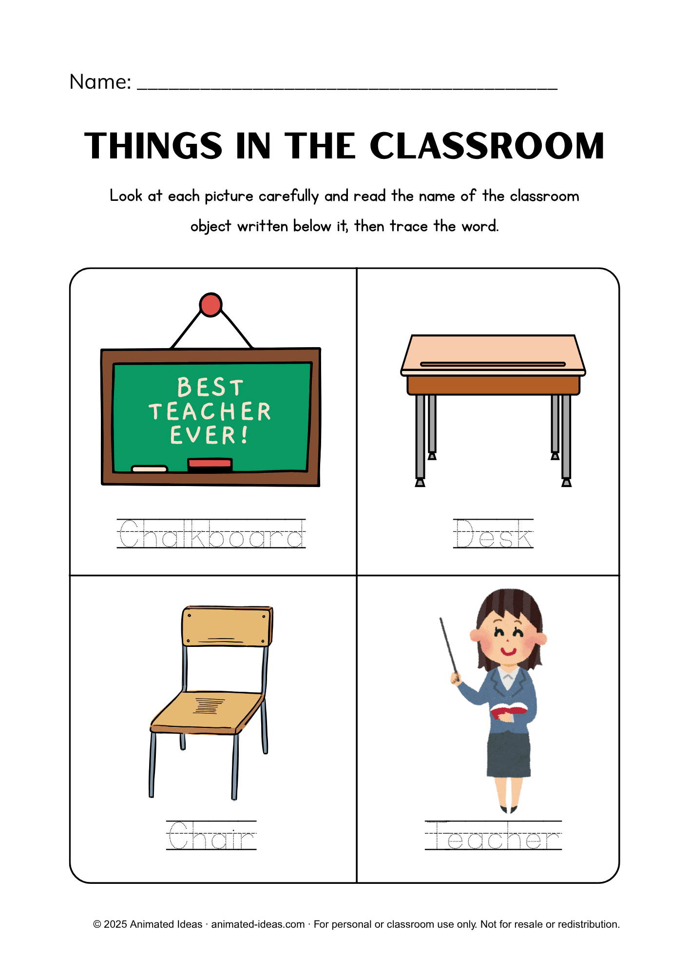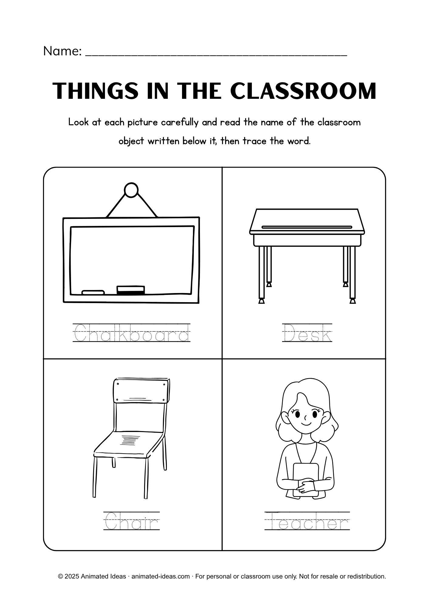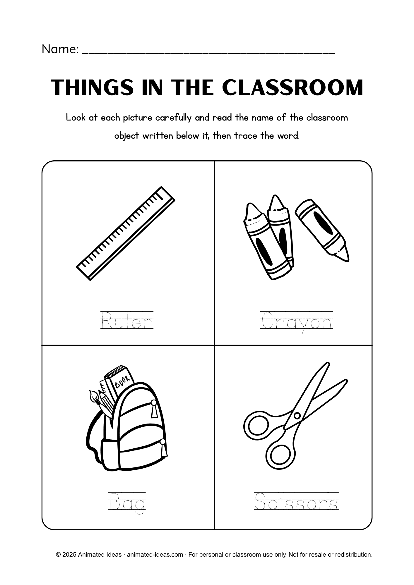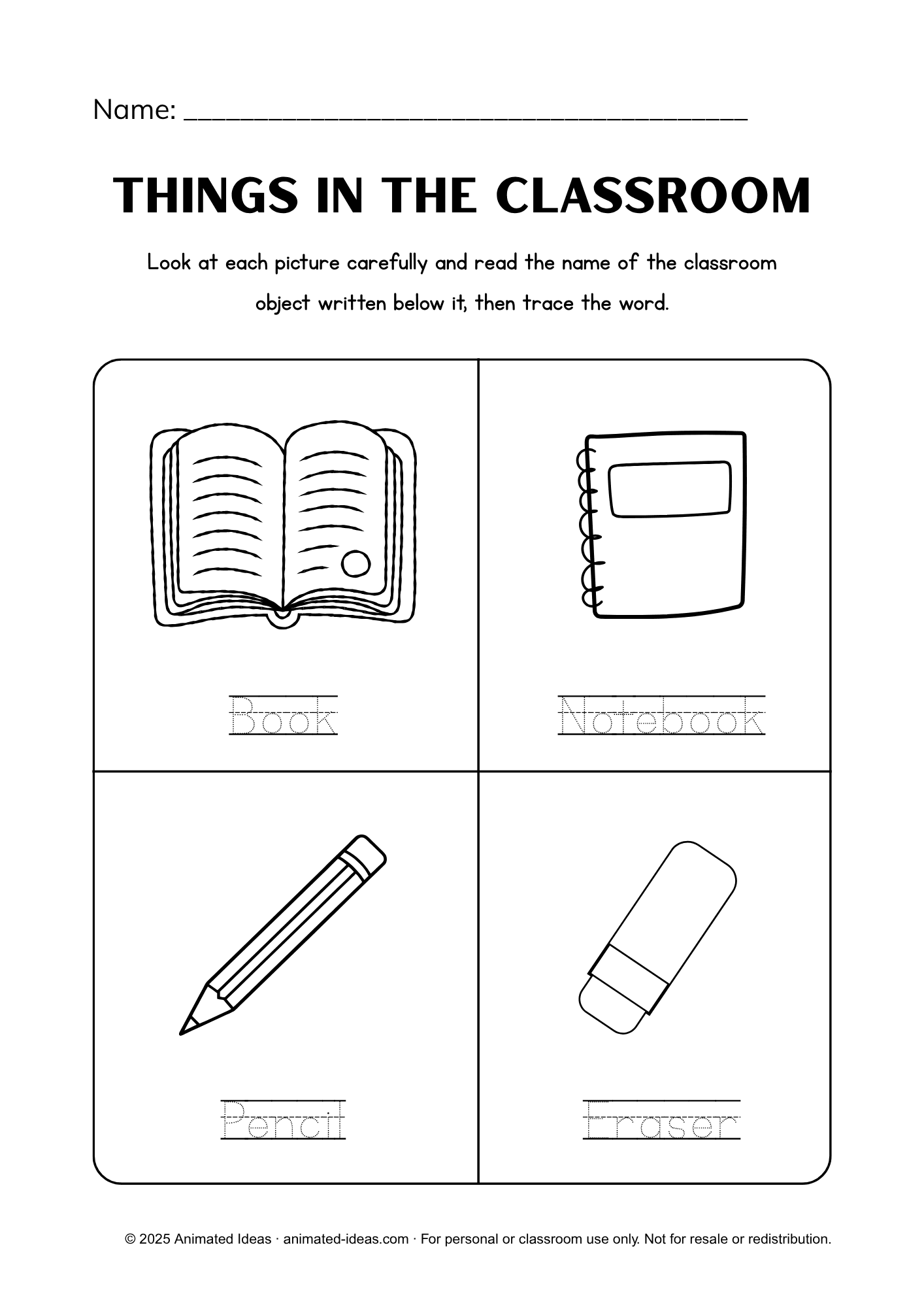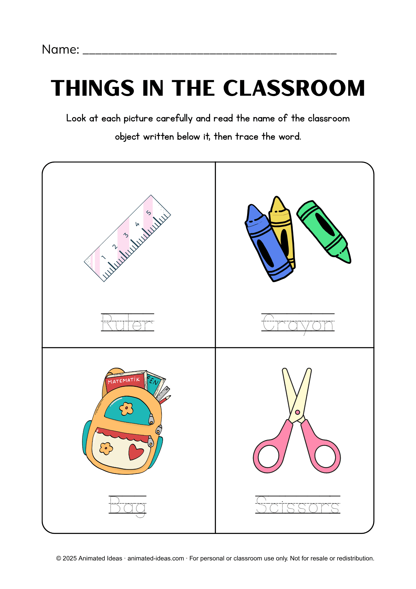 Make learning fun and interactive with the Things in the Classroom – Tracing and Vocabulary Worksheets (Printable PDF)!