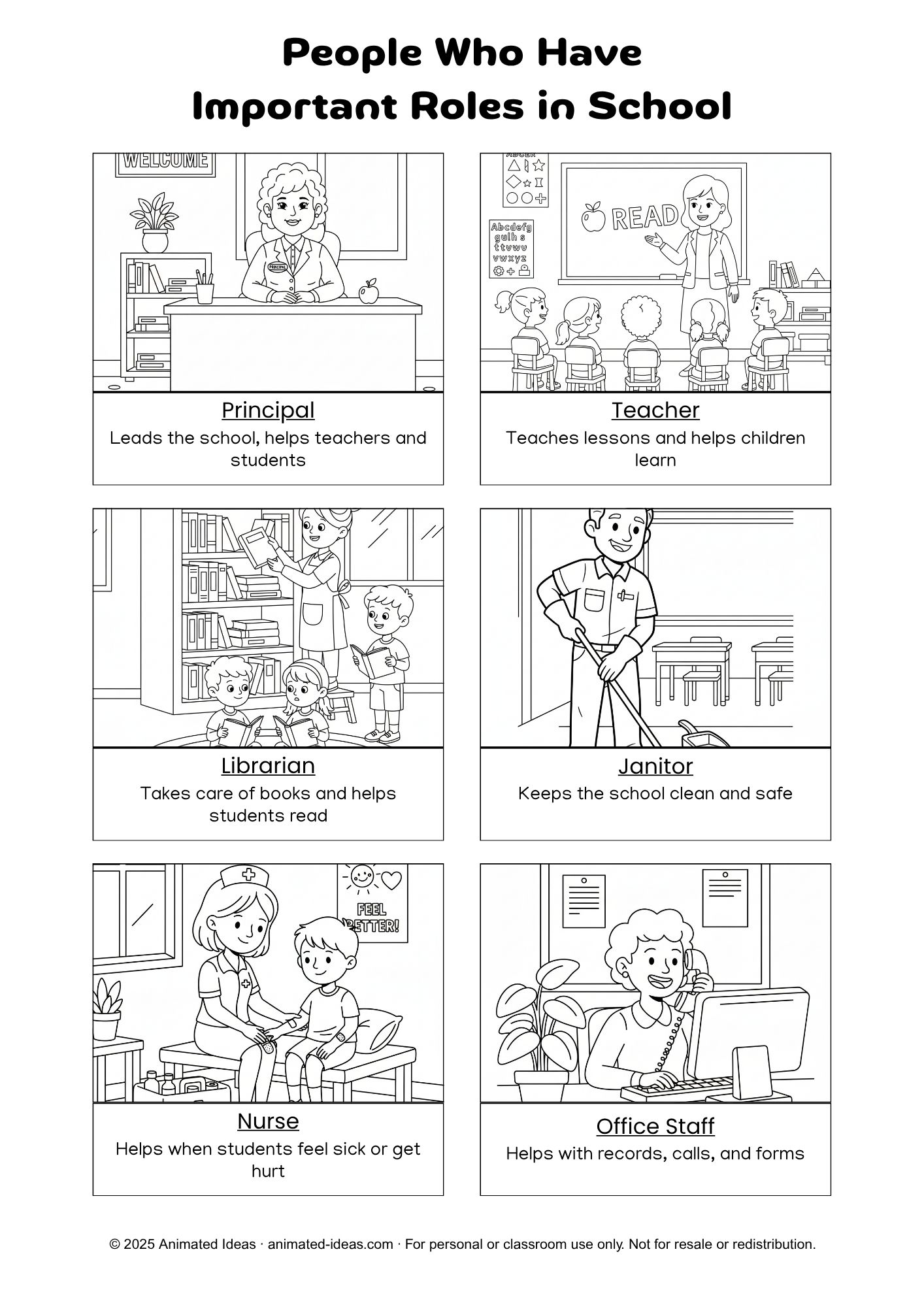 Every person in the school has a special role that makes learning possible. The principal leads the school. The teachers teach lessons. The librarian cares for the books. The janitor keeps the school clean. The nurse takes care of students’ health, and the office staff help with records and information.