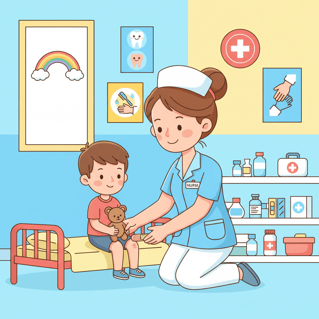 If a child falls and gets a small wound, the nurse cleans it and puts a bandage on it.