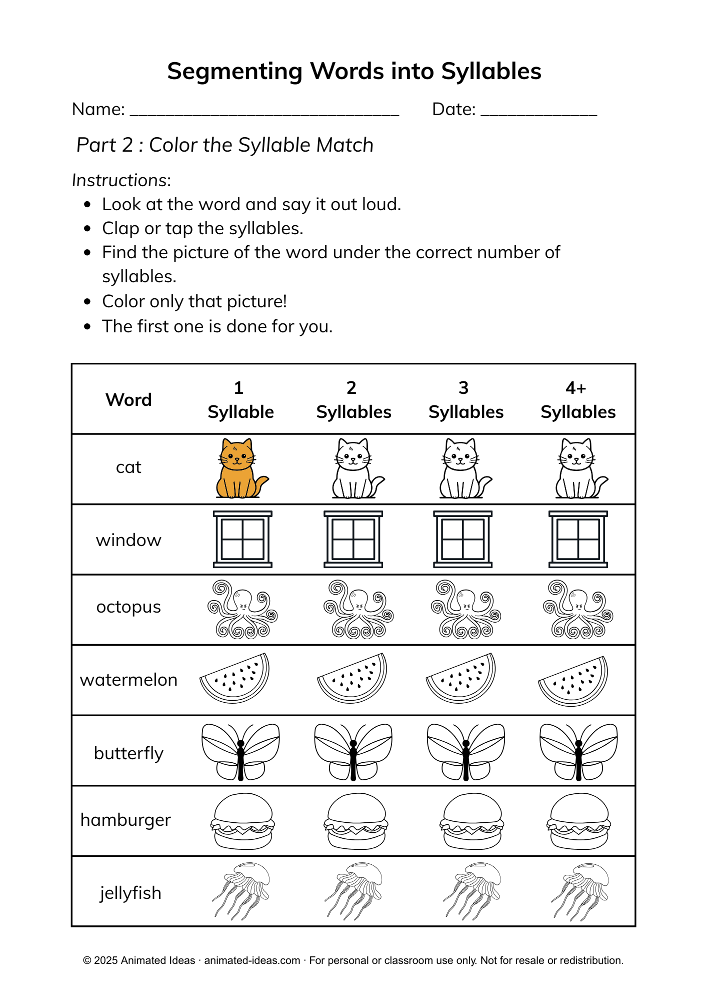 These worksheets are perfect for Grade 1 learners, early readers, ESL students, and even teachers and parents who want structured resources to support learning. They provide a clear and organized way for children to practice breaking words into syllables while keeping the activities fun and interactive.