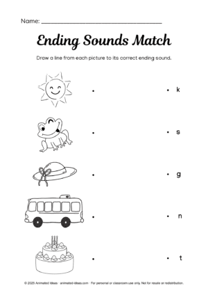 This Ending Sounds Match Worksheet for 1st Grade helps children practice ending sound recognition using simple and clear picture-word activities. It is perfect for phonics practice, assessments, and classroom review.