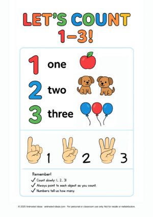 Fun and engaging worksheets for preschoolers to practice counting 1-3. Activities include circling the correct number of items and matching numbers. Printable pages make learning interactive and enjoyable.